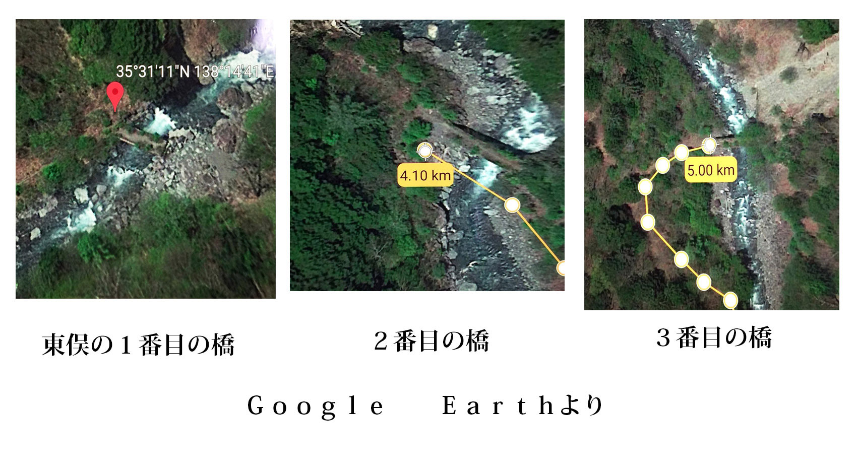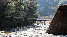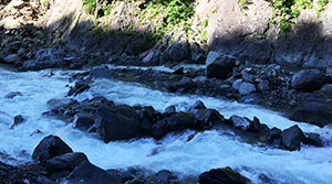 ここまでは30メートル位の高い崖の上の道伝いなので川へ降りていく事はできません。