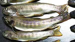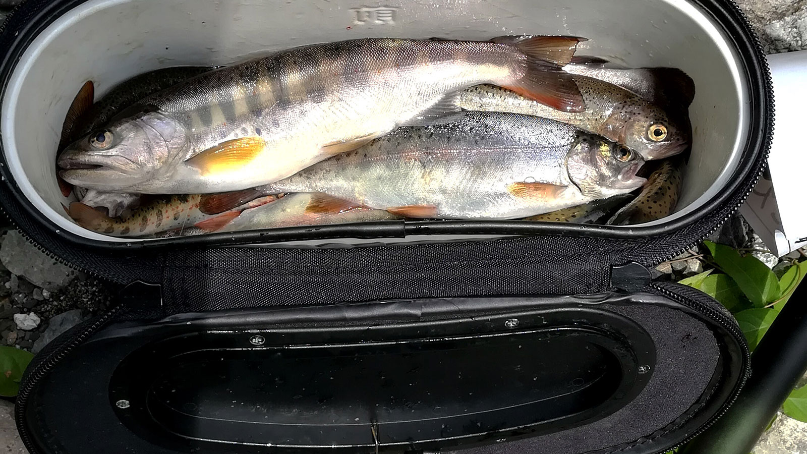 11時頃から活性化してきた岩魚(イワナ)がエサに飛びつくようになり、釣果は10匹(15〜34センチ)です。