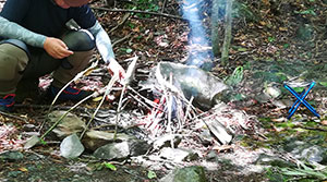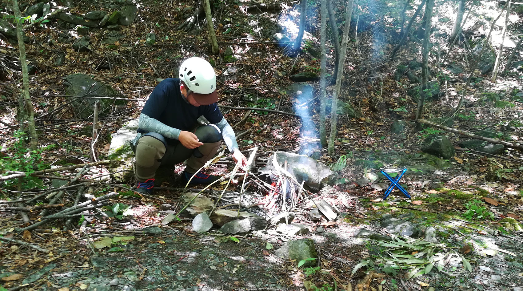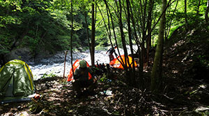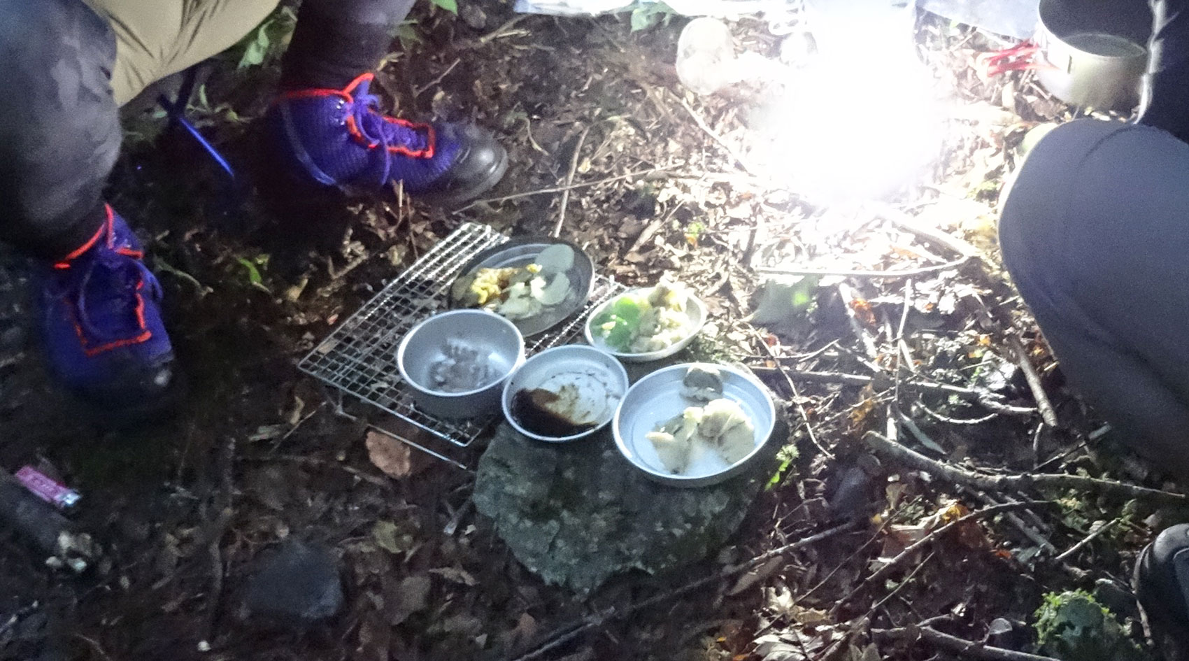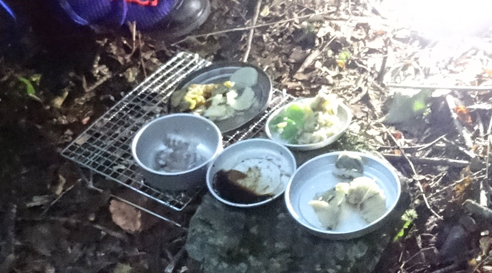 昼前にテント場に戻り、撤退準備と昨日雨に濡れたイワナの塩焼きをIさんとKさんが苦労して火を起こし、塩焼きの続きを始めました。