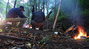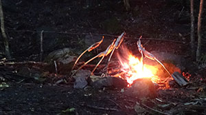 そして食べながらイワナ6匹をたき火の周りで焼いている途中から・・・