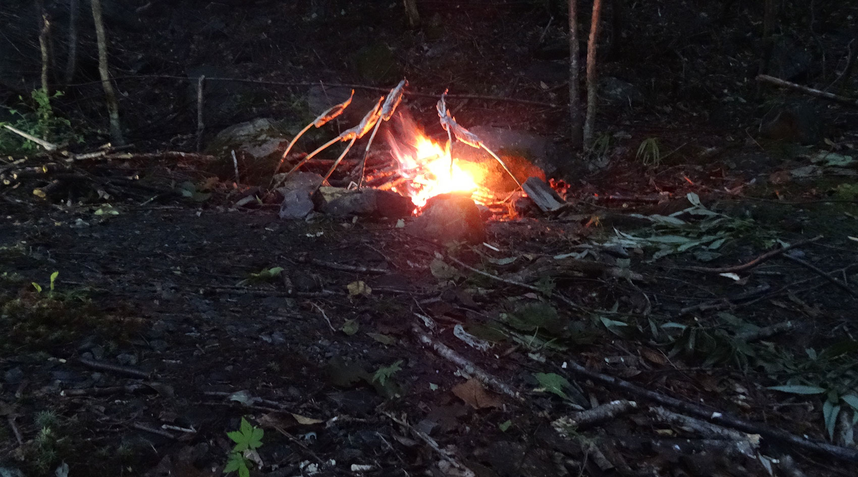 夕立があり、せっかくのイワナが濡れ、火も消えてしまいました。