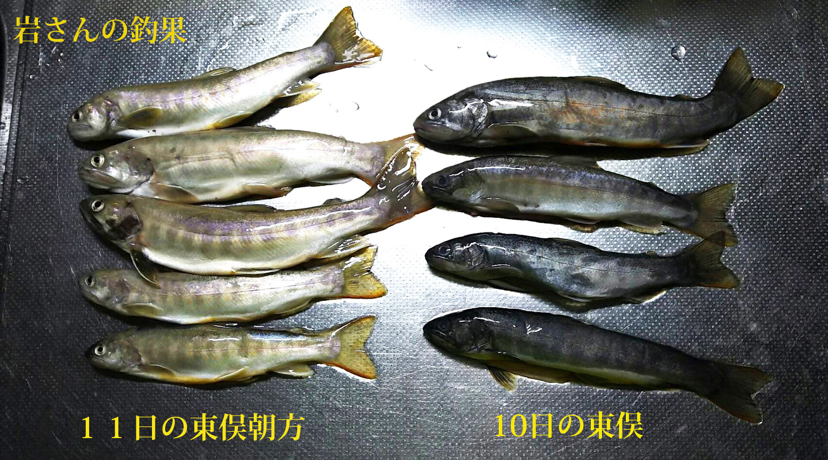 11時頃から活性化してきた岩魚(イワナ)がエサに飛びつくようになり、釣果は10匹(15〜34センチ)です。